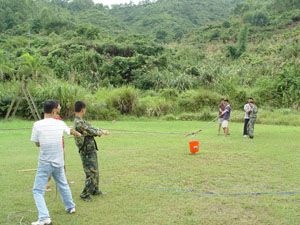 分組團隊在規(guī)定的時間內(nèi),利用資源(兩根長繩、兩根短繩、兩根短木棒)把一個核彈從一定區(qū)域內(nèi)在不接觸地面的情況下運出來到一安全區(qū)域。