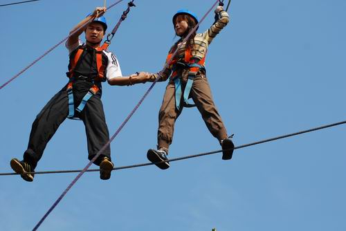 項(xiàng)目簡介: 學(xué)員兩人一組手牽手合作從鋼絲的起點(diǎn)走到對面終點(diǎn)。 項(xiàng)目意義: 體驗(yàn)小團(tuán)隊(duì)合作,強(qiáng)化學(xué)員須要不斷進(jìn)取、勇于探索的精神,同時(shí)明白不管我們的目標(biāo)有多么的遙遠(yuǎn),路途有多么的艱辛,相信自己、相信同伴,我們一定會(huì)成功,相信自己、相信團(tuán)隊(duì)。