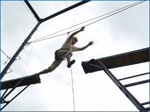 兩塊寬30公分的木板,頂端間隔1.2-1.8米,此木板距地面高5米,做項(xiàng)目的學(xué)員須自一塊木板越起跨到另一木板上并返回。