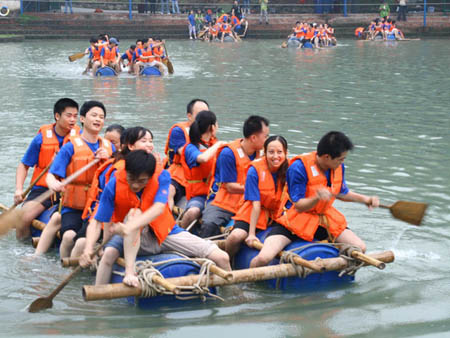 項(xiàng)目簡(jiǎn)介:團(tuán)隊(duì)隊(duì)員利用有限的資源(油桶若干,竹竿若干,繩子)以最快的速度造成一艘船,搭載本隊(duì)隊(duì)員在規(guī)定的時(shí)間內(nèi)劃過規(guī)定水域奪得對(duì)岸的目標(biāo)。