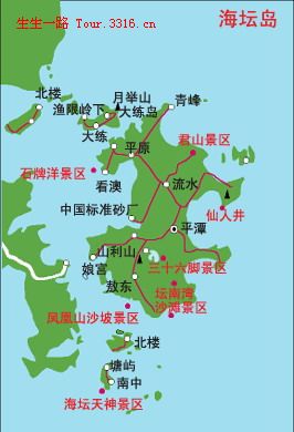 旅游交通指南,海壇島位于閩東南沿海,福清灣東側(cè)。又稱平潭島,是福建省第一大島。島區(qū)峰巒疊嶂,風景秀麗,海產(chǎn)豐富。島上的三十六腳湖,面積2平方千米,湖中有大小龜山、釣魚臺、筆架潭、鯉魚礁等名勝。