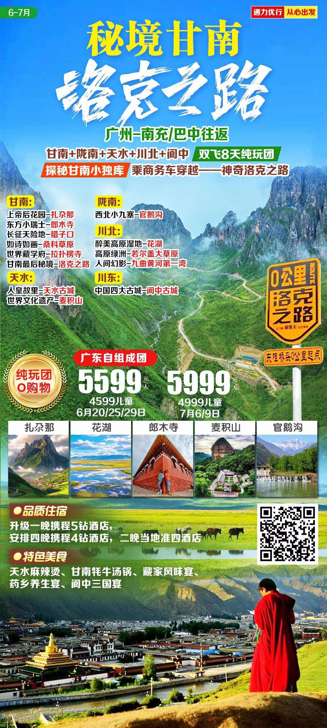 嘆九色甘南,享隴上江南,逛人文天水;揚(yáng)草原牧歌,枕黃河之水,觀長(zhǎng)河落日,臥花湖棧道;游梵天凈土,看世界遺產(chǎn),走進(jìn)四大古城閬中!