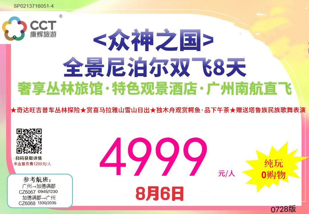 ★ 特色交通:廣州起止,南航直飛加德滿都,減少轉(zhuǎn)機(jī)疲勞;