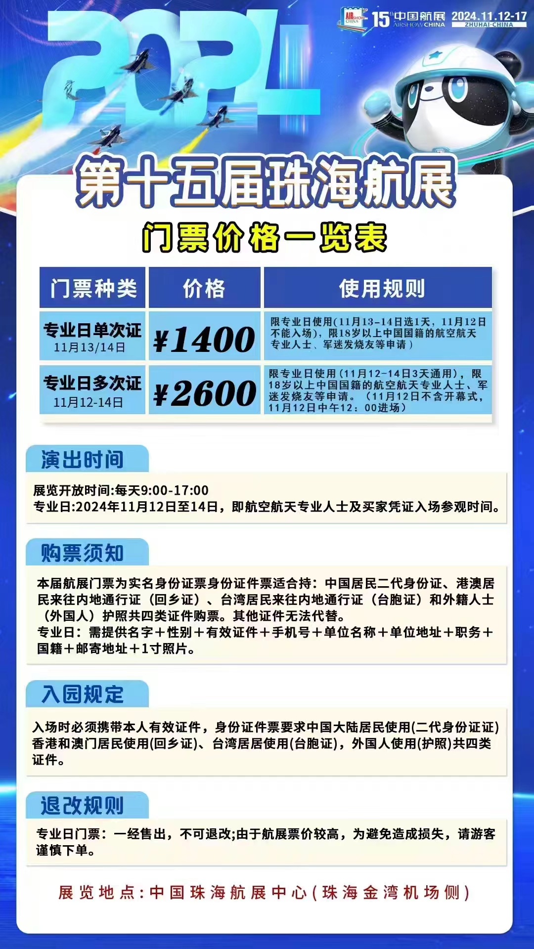 專業(yè)日門票:一經(jīng)售出,不可退改;由于航展票價較高,為避免造成損失,請游客