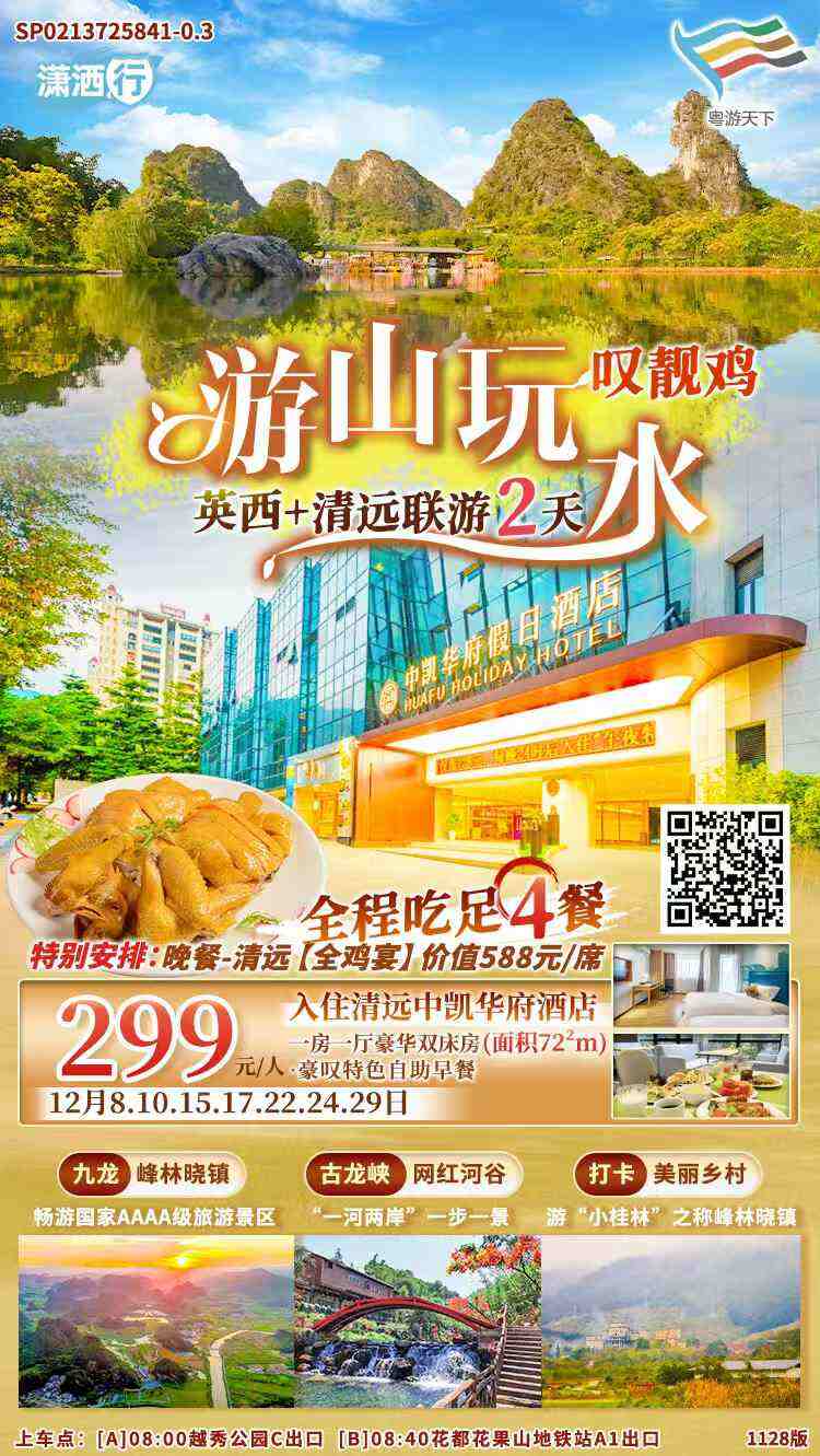 【游山玩水嘆靚雞】廣州往返英西峰林曉鎮(zhèn)+古龍峽、豪嘆酒店全雞宴、吃足4餐純玩2天