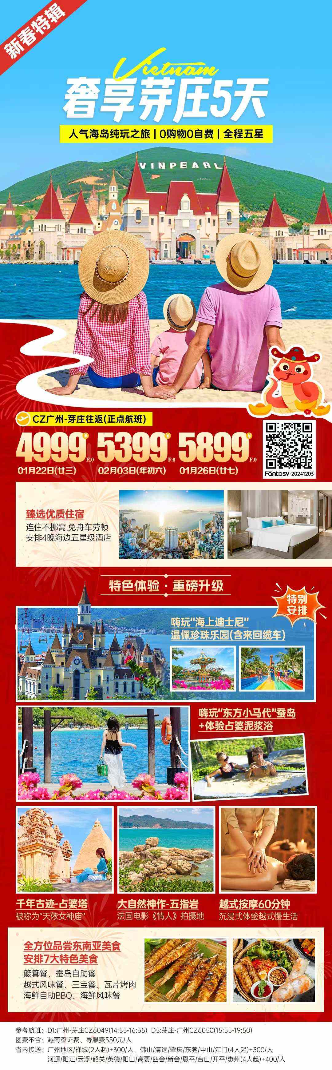 參考航班:D1:廣州-芽莊CZ6049(14:55-16:35)D5:芽莊-廣州CZ6050(15:55-19:50)