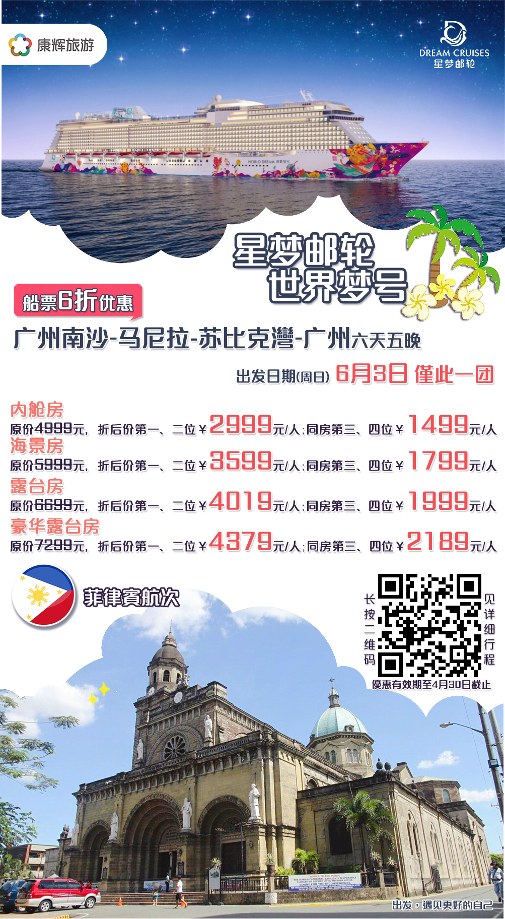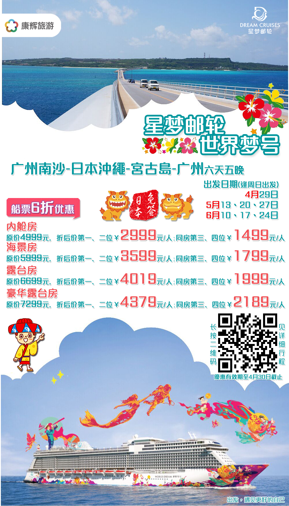 優(yōu)惠活動適用于:4月1日至6月24日出發(fā)航次,報(bào)價(jià)為折后船票價(jià)