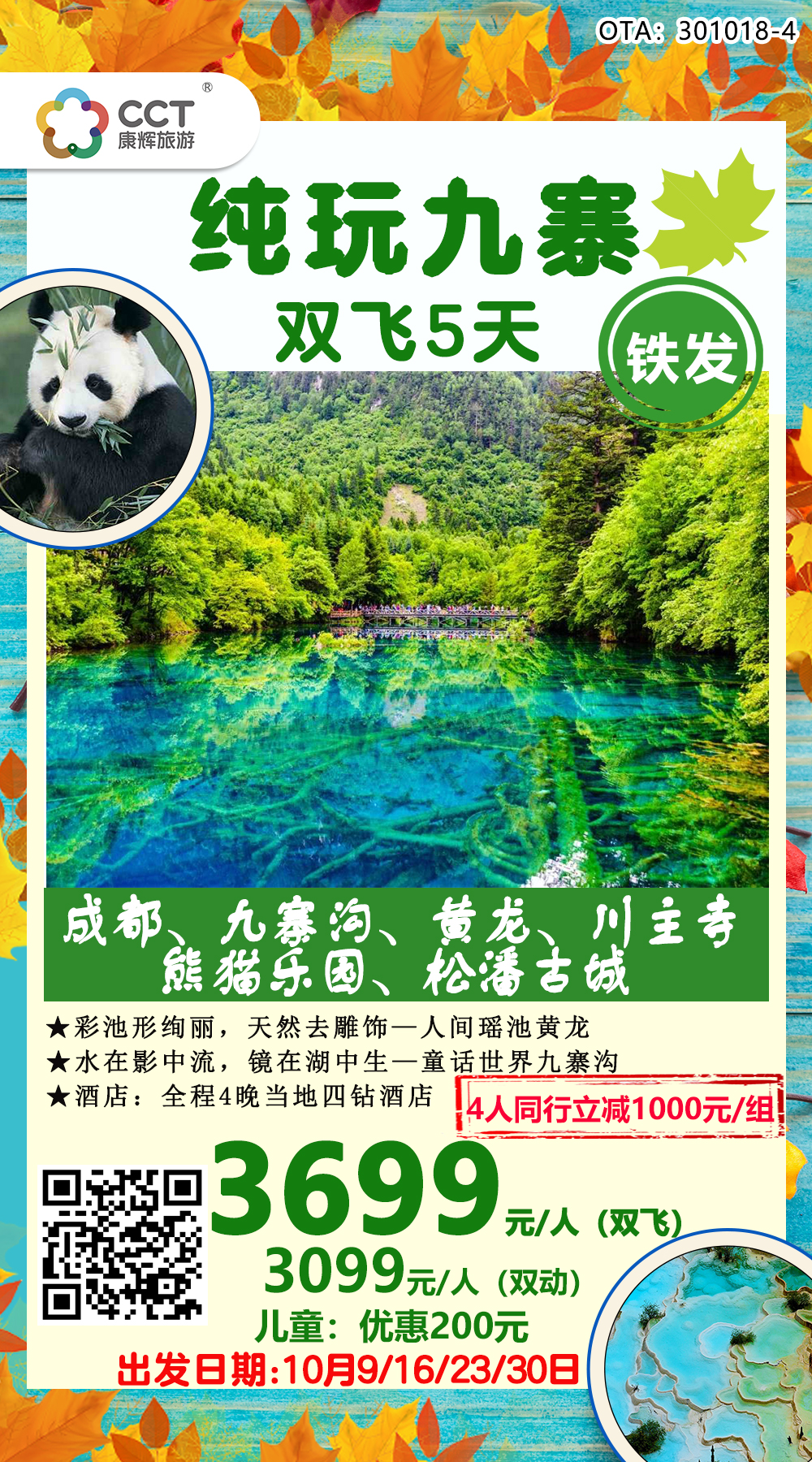2、 門票:含黃龍門票,九寨溝門票,九寨溝觀光車。不含黃龍索道上行80/人,下行40/人,不含熊貓樂園電瓶車10/人+耳麥20/人。