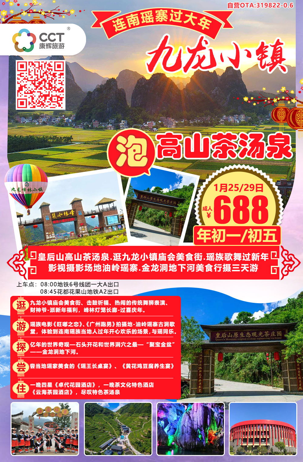 齊歡慶,過(guò)大年~皇后山高山茶湯泉●逛九龍小鎮(zhèn)廟會(huì)美食街●瑤族歌舞過(guò)新年●影視攝影場(chǎng)地油嶺瑤寨●金龍洞地下河美食行攝三天游