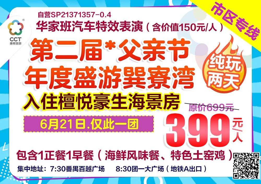 7:30番禺百越廣場/8:30團一大廣場(地鐵A出口)準時出發(fā)。乘車前往惠州巽寮灣(行車時間大約3.5小時)。約11:30抵達后,享用午餐,餐后酒店辦理入住手續(xù),18:10集中前往[華家班]欣賞汽車特技表演(如觀看時間有變化以導游通知為準),晚上自由活動。