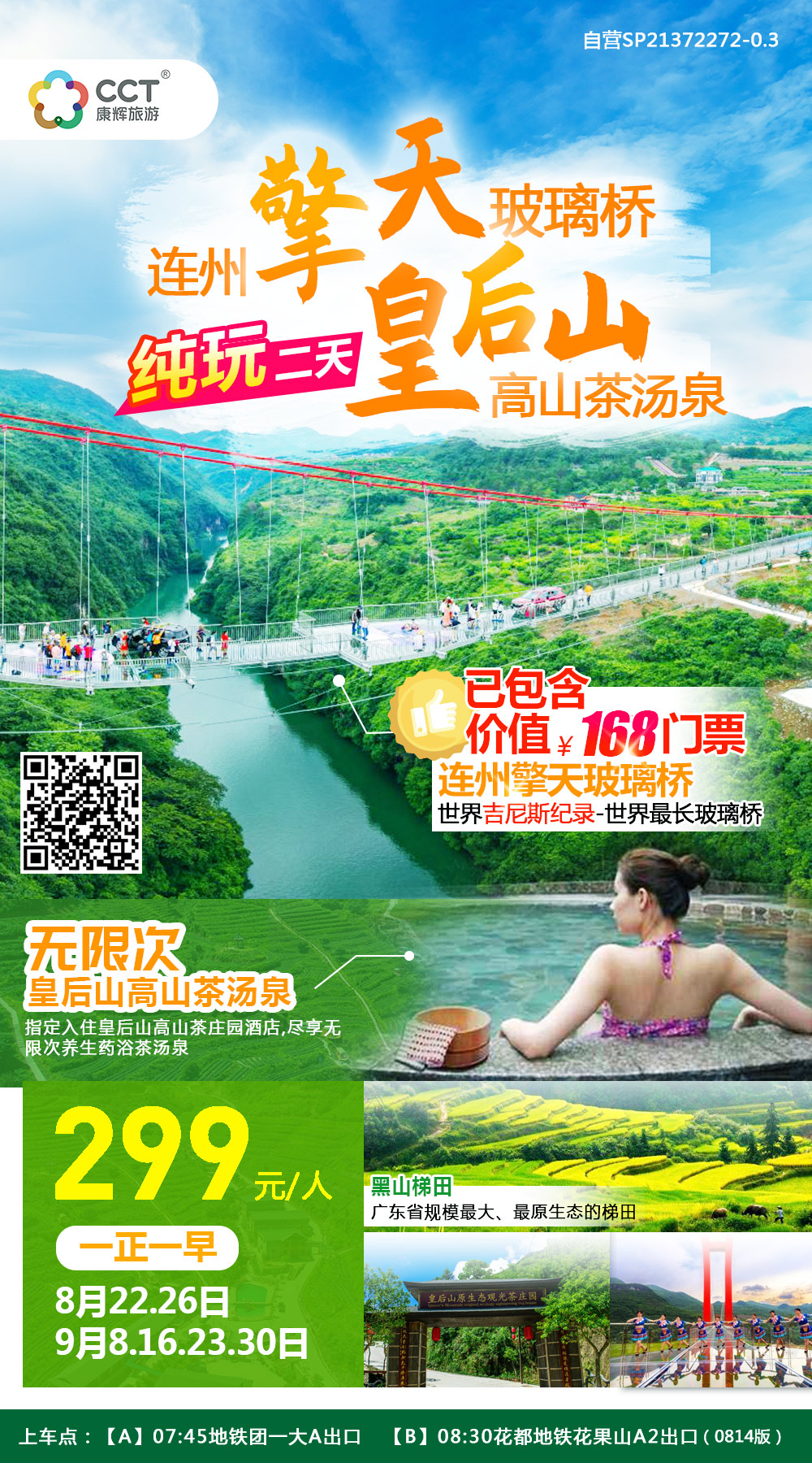第1天:出發(fā)地—抵達(dá)清遠(yuǎn)連州—午餐(特色風(fēng)味宴)—擎天玻璃橋—皇后山--晚餐自理—入?。哼B山皇后山瑤家寨云海茶湯泉酒店。