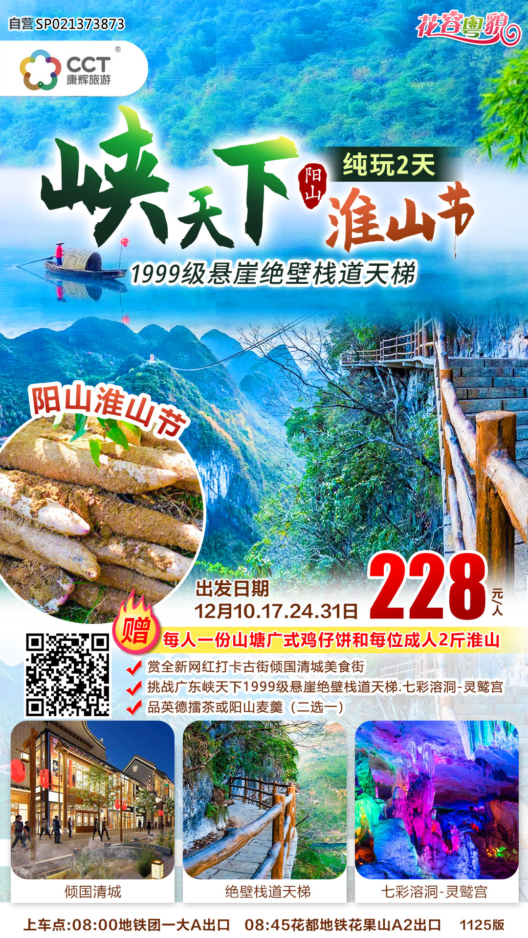 14:30前往【廣東峽天下景區(qū)】(含大門票),廣東峽天下景區(qū)位于清遠陽山到廣東第一峰必經路的嶺背鎮(zhèn),景區(qū)依托廣東境內罕見的喀斯特峽谷群、峰叢地貌、懸崖絕壁、天然河道和神秘溶洞等自然資源,著力打造國內一流的自然風光和極限體驗生態(tài)旅游景區(qū)。欲登云天渡(因個人自身因素不含天云渡玻璃橋,自費120元/人),可乘坐景區(qū)觀光車登上光明頂(單程20元/人)。天云渡玻璃橋長588米、高488米,為世界最長最高的玻璃吊橋,堪稱世界奇跡!跨過天云渡到達縹緲峰,可挑戰(zhàn)1999級懸崖絕壁棧道天梯及穿過靈鷲宮天然喀斯特溶洞。懸崖天梯盤旋在斷魂崖絕壁之上,39道拐如飛龍般纏繞在山腰之間,頗有一夫當關、萬夫莫開之勢。靈鷲宮是縹緲峰的靈魂,坐落在縹緲峰斷魂崖萬丈絕壁之上。是一個天然喀斯特溶洞,每當氣溫驟降,洞口便會呈現吞云吐霧的神奇景象,當地人傳說,那是神仙在洞里隱居修仙所吐出的真氣。游客可以根據自身條件選擇步行或者乘坐天龍滑道(自愿自費30元/人)下山。