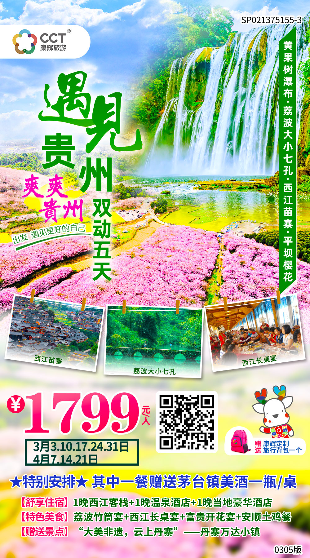 【爽爽貴州】貴州黃果樹、大小七孔、西江、丹寨小鎮(zhèn)、平壩櫻花雙動5天4晚跟團(tuán)游