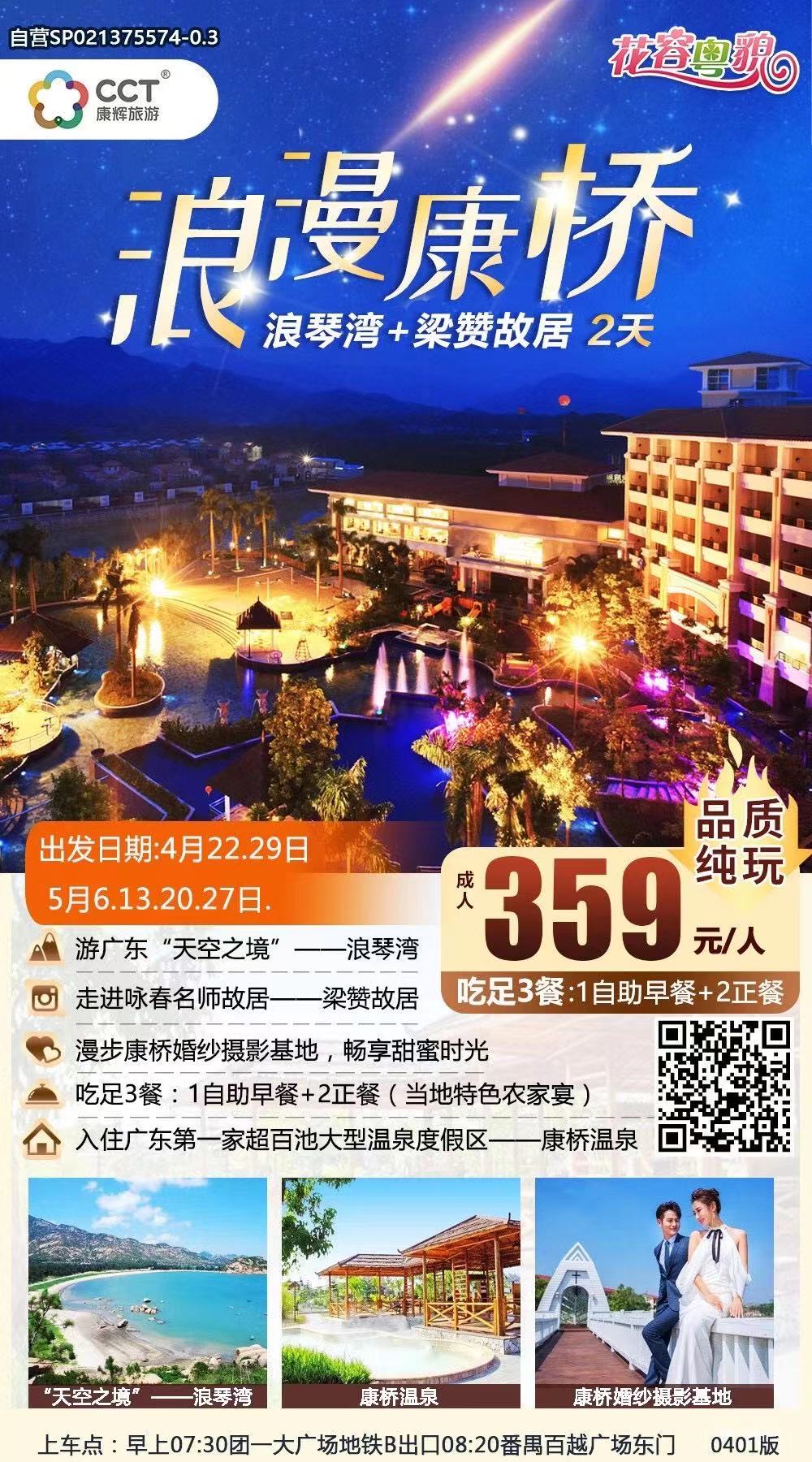 約 10:30-12:30 抵達(dá)都斛餐廳,午餐自理,豐儉由人 約 13:00-14:30 前往浪琴灣景區(qū)、浪琴灣,是廣東省臺山市一景區(qū),位于臺山市北陡鎮(zhèn)南部海灣,浪 琴灣已經(jīng)開發(fā)了。從北陡鎮(zhèn)陡門區(qū)向南行 18 公里,可見到前方出現(xiàn)一片長長的木麻黃防風(fēng)林帶,林帶的背 后,就是若隱若現(xiàn)的蔚藍(lán)色大海。浪琴灣長 2 公里,沙灘平緩,寬廣舒展,沙粒純凈,海水潔凈。灘后松 林茂密,灘前碧波萬頃。浪花之中,遠(yuǎn)處的上、下川島如海上仙山,浮浮沉沉,景色十分壯觀 [1] 。置 身于此,好像進(jìn)入一種海闊天空的神奇境界。(車程約 1.5 小時,游覽時間約 2 小時) 約 16:15-18:00 前往康橋溫泉辦理入住、后自由活動或浸泡溫泉(車程 1.5 小時)。晚餐時間請客人 前往餐廳用餐(用餐時間以導(dǎo)游通知為準(zhǔn))