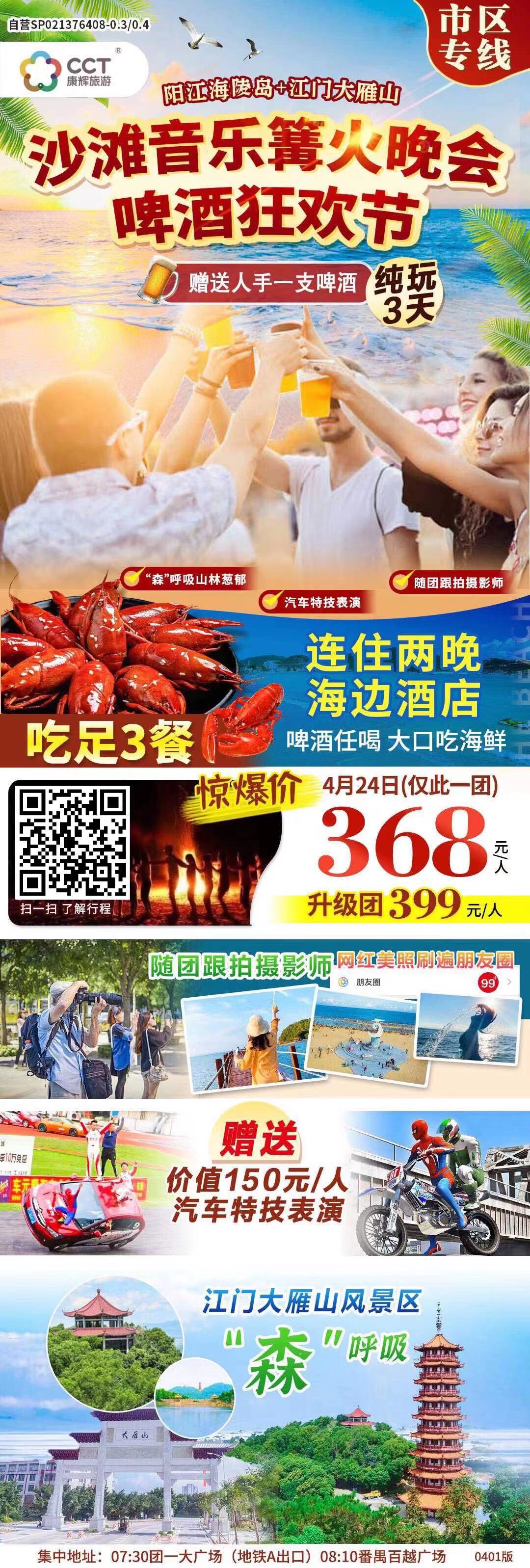 第1天:廣州-江門鶴山大雁山風(fēng)景區(qū)(車程約1小時(shí))-陽(yáng)江海陵島(車程約2.5小時(shí))-午餐-入住酒店-下午自由活動(dòng)-晚餐-晚上8:00前往海邊沙灘參加篝火晚會(huì)(含午餐、晚餐)