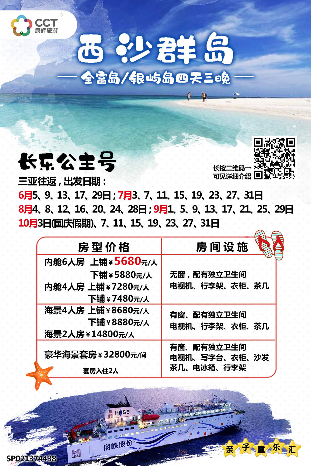 “長樂公主”號(hào)郵輪房型有豪華海景套房,豪華海景房,內(nèi)艙豪華客房共88間,此外還有永興島宴會(huì)廳,全富島休閑吧,金銀島會(huì)所,珊瑚島俱樂部,廣金島超市,甘泉島燒烤吧,永樂大舞臺(tái),西沙郵局等多元化娛樂休閑場所和服務(wù)設(shè)施。