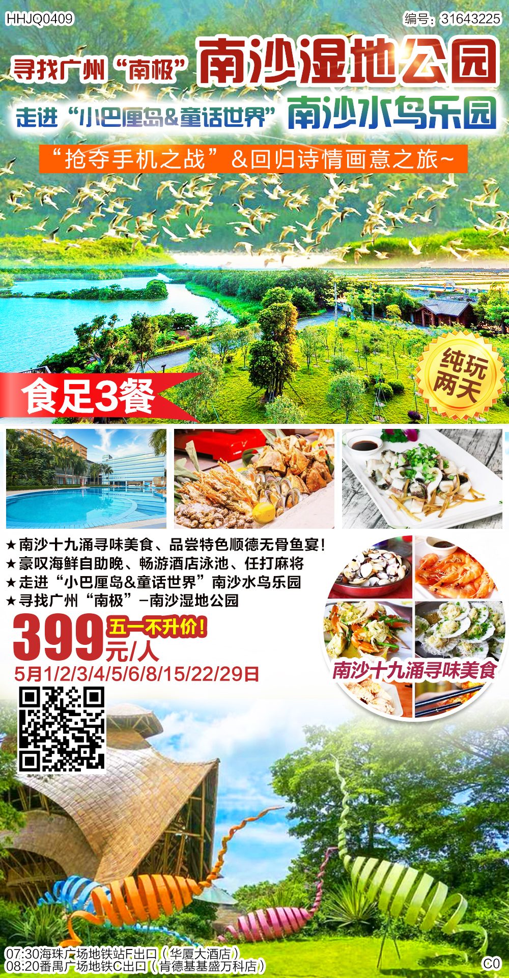 五一不升價(jià)!【豪嘆海鮮自助晚餐、任打麻將】¥399食足3餐純玩2天~打卡南沙濕地公園、水鳥樂園、沙灣古鎮(zhèn)、暢游順德駿景酒店泳池~