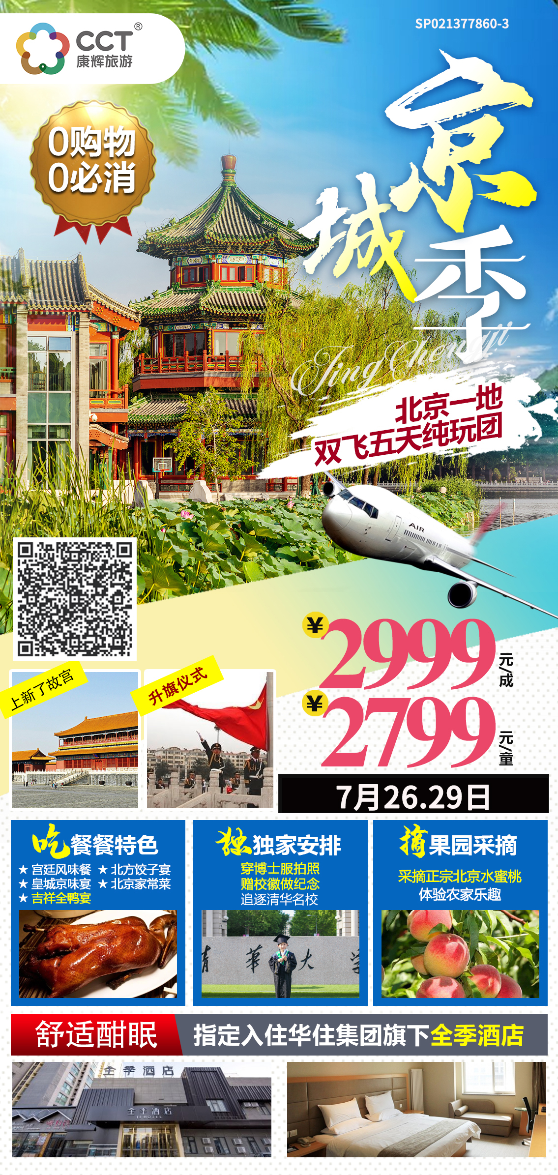 特別提醒:各位親愛的游客,有一種安全保障叫做飛機延誤,有一種完美行程叫做不可遺漏,所以如遇特殊情況導致飛機延誤,您會舍掉一晚提前訂好的住房,增加一晚延期的房費,但是得到的依然是完美的行程,依然是相擁北京的美好經(jīng)歷。在帝都品味舍得,您的游覽會同樣精彩。(因飛機延誤或取消導致當晚無法入住的,房費無法退還。因順延行程導致延住的房費,需游客自理)