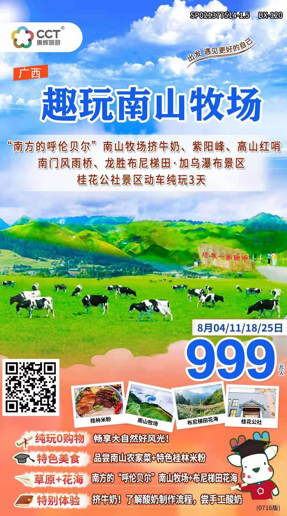 早餐后,暢游【南山牧場(chǎng)】(游覽時(shí)間不少于2小時(shí))南山大草原既有北國(guó)草原的蒼茫雄渾,又有江南山水的靈秀神奇,站在【紫陽(yáng)峰】遙望一望無(wú)際的大草原,一群群牛羊點(diǎn)綴在廣闊的芳草叢中,構(gòu)成了一幅雄闊、壯美、典型的高山臺(tái)地草原牧場(chǎng)風(fēng)景圖。這里翠崗連綿,草山起伏,綠浪滾滾,極似碧波蕩漾的海洋,令人賞心悅目,心曠神怡。午餐后,然后可參觀【高山紅哨】是六十年代毛主席親自譽(yù)名的防空哨所,哨所設(shè)施完備,結(jié)構(gòu)堅(jiān)固,有營(yíng)房、飛機(jī)、坦克、大炮等,讓您感受歷史的滄桑。參觀酸奶制作流程,參與擠牛奶體驗(yàn),每人贈(zèng)送一瓶新鮮酸奶!之后乘車前往(車程約2小時(shí))游覽【布尼梯田·加烏瀑布景區(qū)】(游覽約2小時(shí),不含景區(qū)觀光纜車,當(dāng)?shù)亟粚?dǎo)游),占地總面積近千畝,海拔跨度在400到1600米之間,隨著山勢(shì)不斷變化,景色也隨之豐富起來(lái),有色彩繽紛的花海梯田,在這里您將欣賞到格?;ê妥淼ㄗ习纂p色組成的千畝梯田花海的壯觀景色?。ㄗⅲ禾飯@中的花期受當(dāng)?shù)貧夂虻扔绊懀煌募竟?jié)有不同的香味和色彩!以實(shí)際為準(zhǔn)!)驚險(xiǎn)刺激的高山疊瀑,自帶韻味的風(fēng)情桑江。后乘車前往桂林(車程約2.5小時(shí))后入住酒店,晚餐自理。