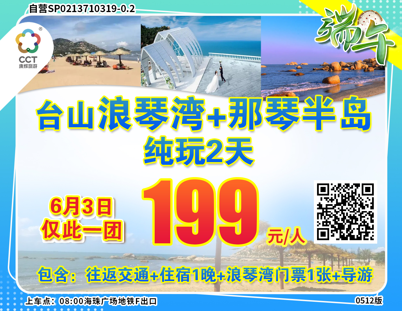早上 8:00分海珠廣場地鐵F出口華廈大酒店集中上車(集中時(shí)間地點(diǎn)如有變動(dòng)按導(dǎo)游通知為準(zhǔn))前往【浪琴灣】(門票已含),后自由活動(dòng)。浪琴灣,是廣東省臺(tái)山市一景區(qū),位于臺(tái)山市北陡鎮(zhèn)南部海灣,浪琴灣已經(jīng)開發(fā)了。從北陡鎮(zhèn)陡門區(qū)向南行18公里,可見到前方出現(xiàn)一片長長的木麻黃防風(fēng)林帶,林帶的背后,就是若隱若現(xiàn)的蔚藍(lán)色大海。
