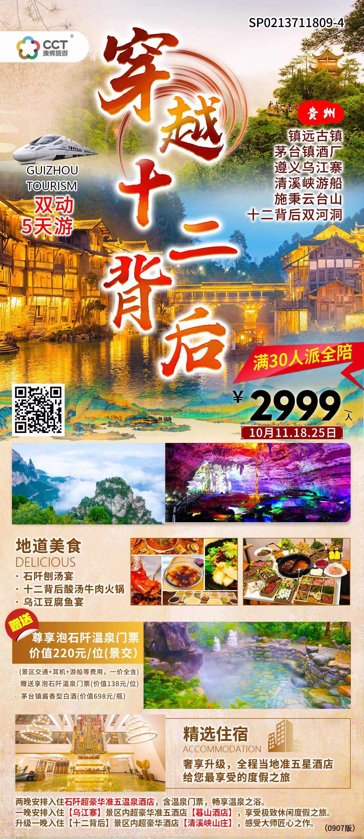 ① 交通: 往返動車二等座。貴州當(dāng)?shù)卣?guī)空調(diào)旅游車(車型根據(jù)出團(tuán)人數(shù)安排,保證1人1正座)。由于動車座位均為鐵路售票系統(tǒng)自動分配,不保證座位連座和同個車廂。