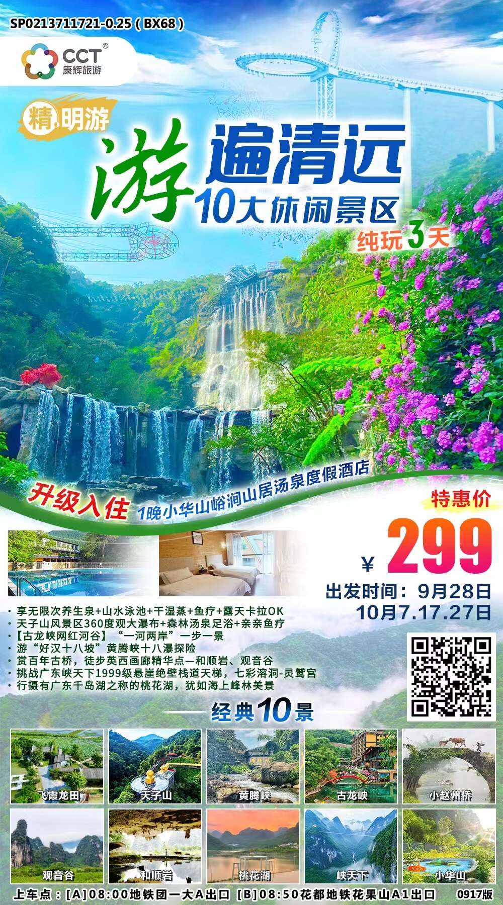 【精明游】廣州往返游遍清遠英西10景純玩3天.升級一晚小華山峪澗山居湯泉度假酒店
