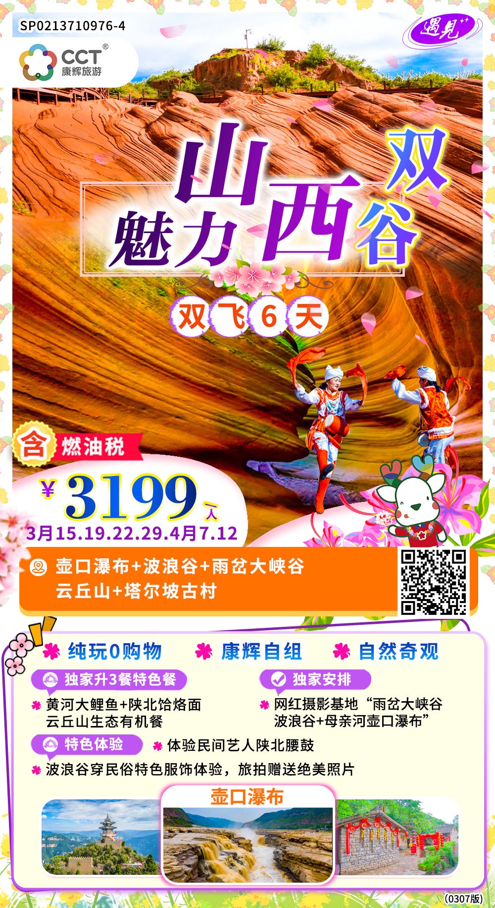 【遇見-魅力雙谷】廣州往返山西+壺口瀑布+波浪谷+雨岔大峽谷+云丘山雙飛6天
