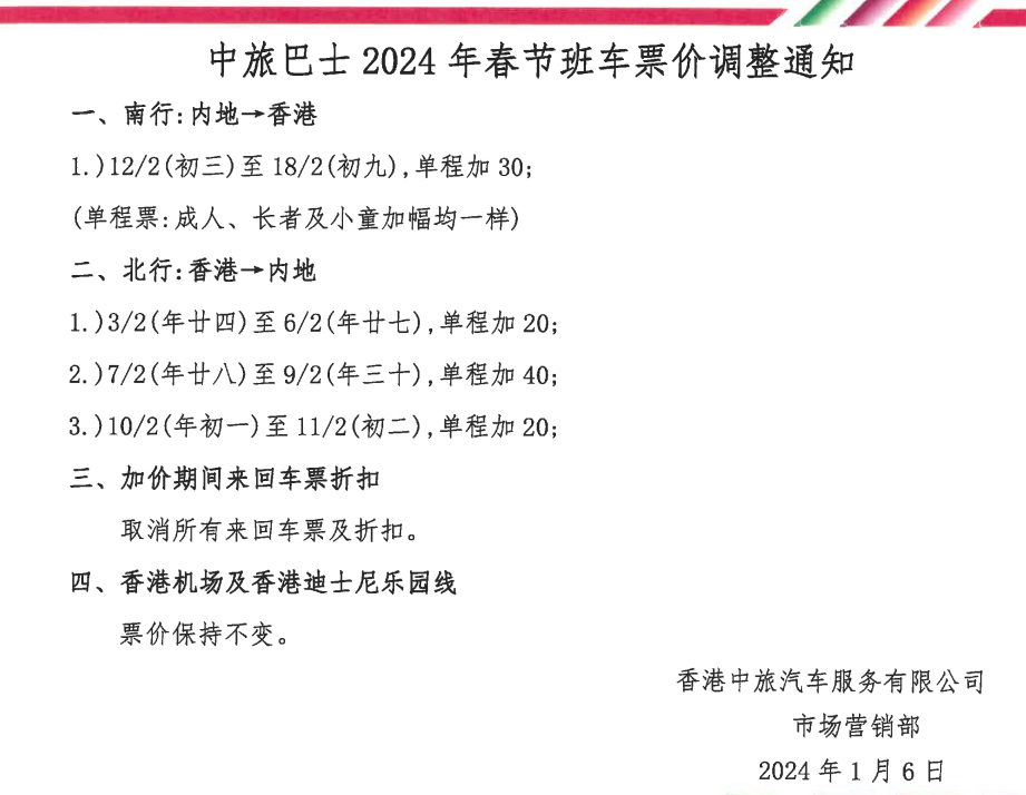 中旅巴士 2024 年春節(jié)班車票價調整通知一、南行:內地一香港