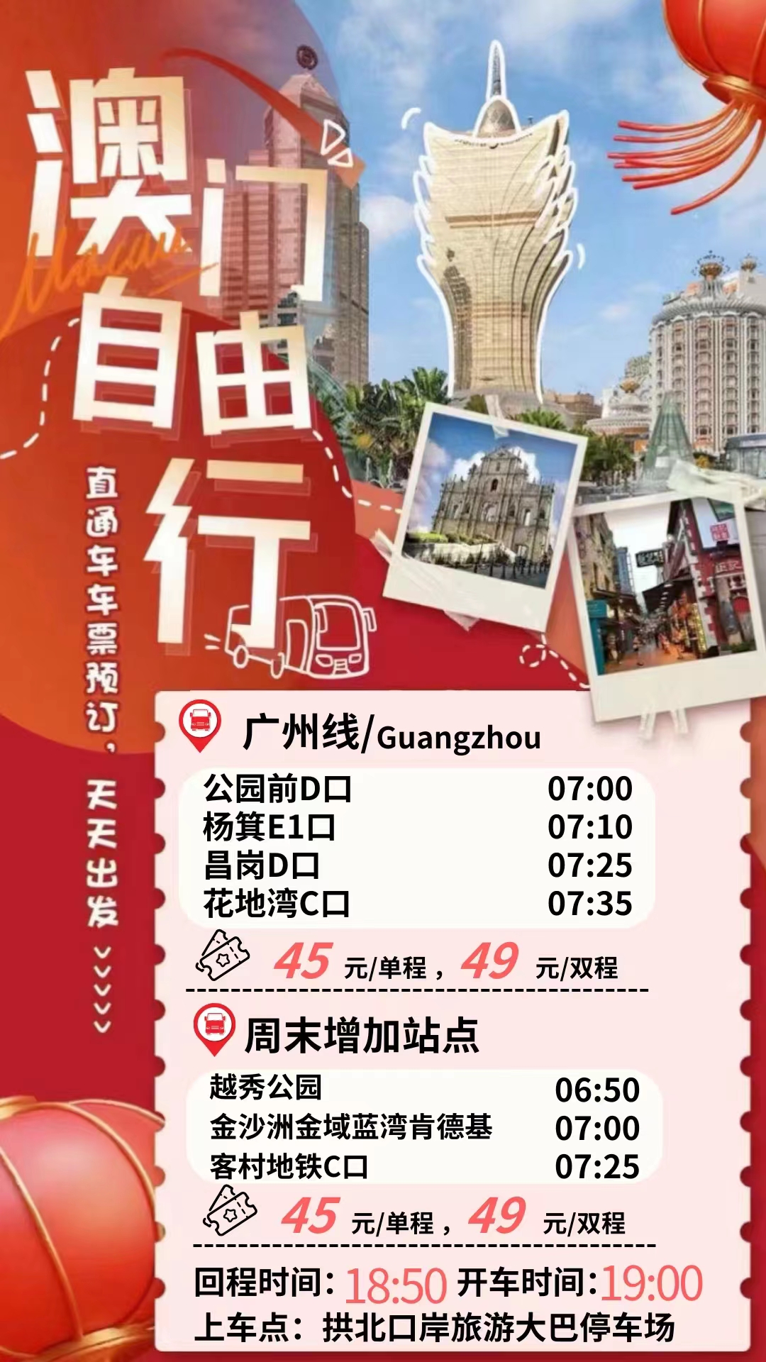 澳門(mén)自由行單程45,雙程49,掃碼關(guān)注可自主在線實(shí)時(shí)預(yù)定