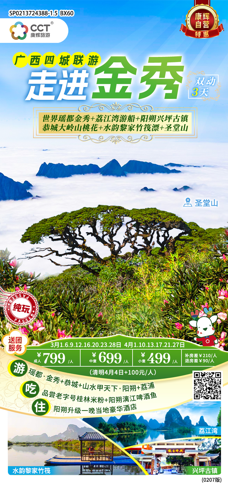 廣州往返廣西,走進(jìn)金秀 圣堂山+荔江灣+興坪古鎮(zhèn)+ 恭城大嶺山李花動(dòng)車3天