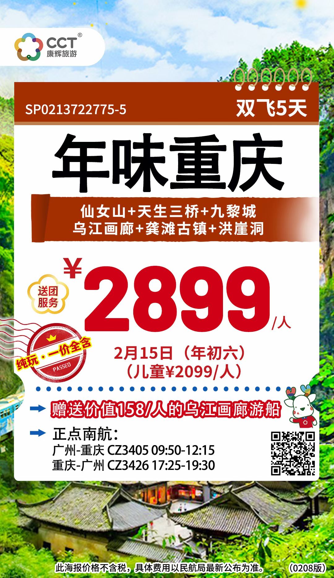 <春節(jié)·特惠> 廣州往返,年味重慶 天生三橋、仙女山、龔灘古鎮(zhèn) 純玩雙飛5天