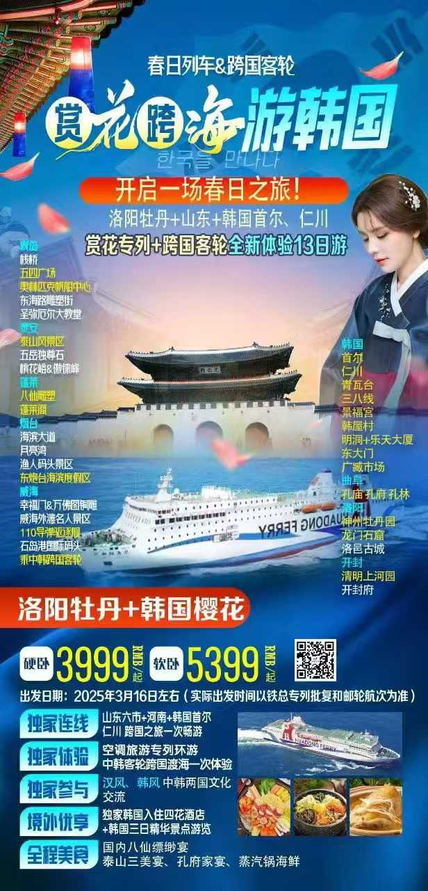 賞花跨海游韓國(guó),中韓兩國(guó)<空調(diào)專列+跨國(guó)客輪?????????