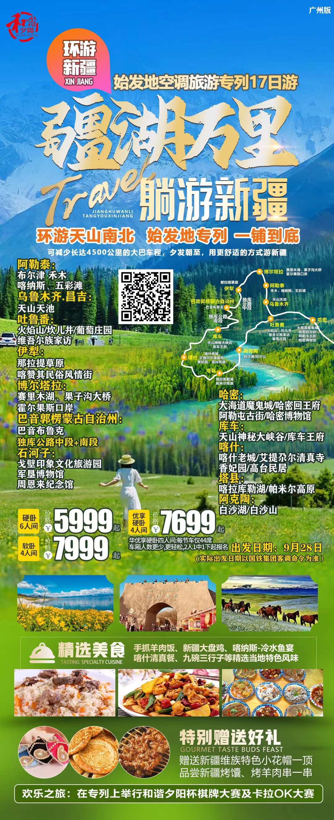 王不游條宿始發(fā)地空調(diào)旅游專列17日游XIN JIAN弱明萬里7.躺游新疆環(huán)游天山南北始發(fā)地專列 一鋪到底可減少長(zhǎng)達(dá)4500公里的大巴車程,夕發(fā)朝至,用更舒適的方式游新